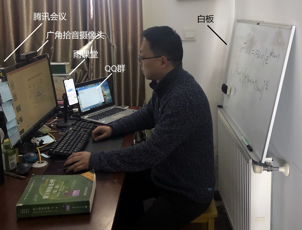 担任数字图像处理课程的夏思宇老师为了更好的课堂演示和实时讨论效果,多种设备齐上阵。