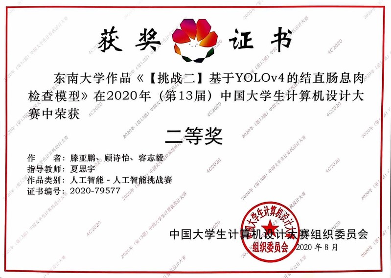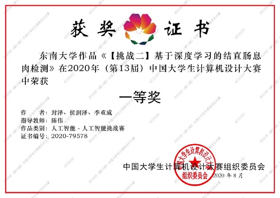 近日,2020年(第13届)中国大学生计算机设计大赛落下帷幕。365best体育亚洲官网17级本科生封泽、侯润泽、季重威,18级本科生腾亚鹏、顾诗怡、容志毅在人工智能挑战赛——直肠结息肉检测任务中分获一等奖与二等奖,另外,17级本科生曹中豪等凭借作品《天气之子——基于深度学习的雷达回波预测与短临暴雨预警系统》获得人工智能组二等奖。