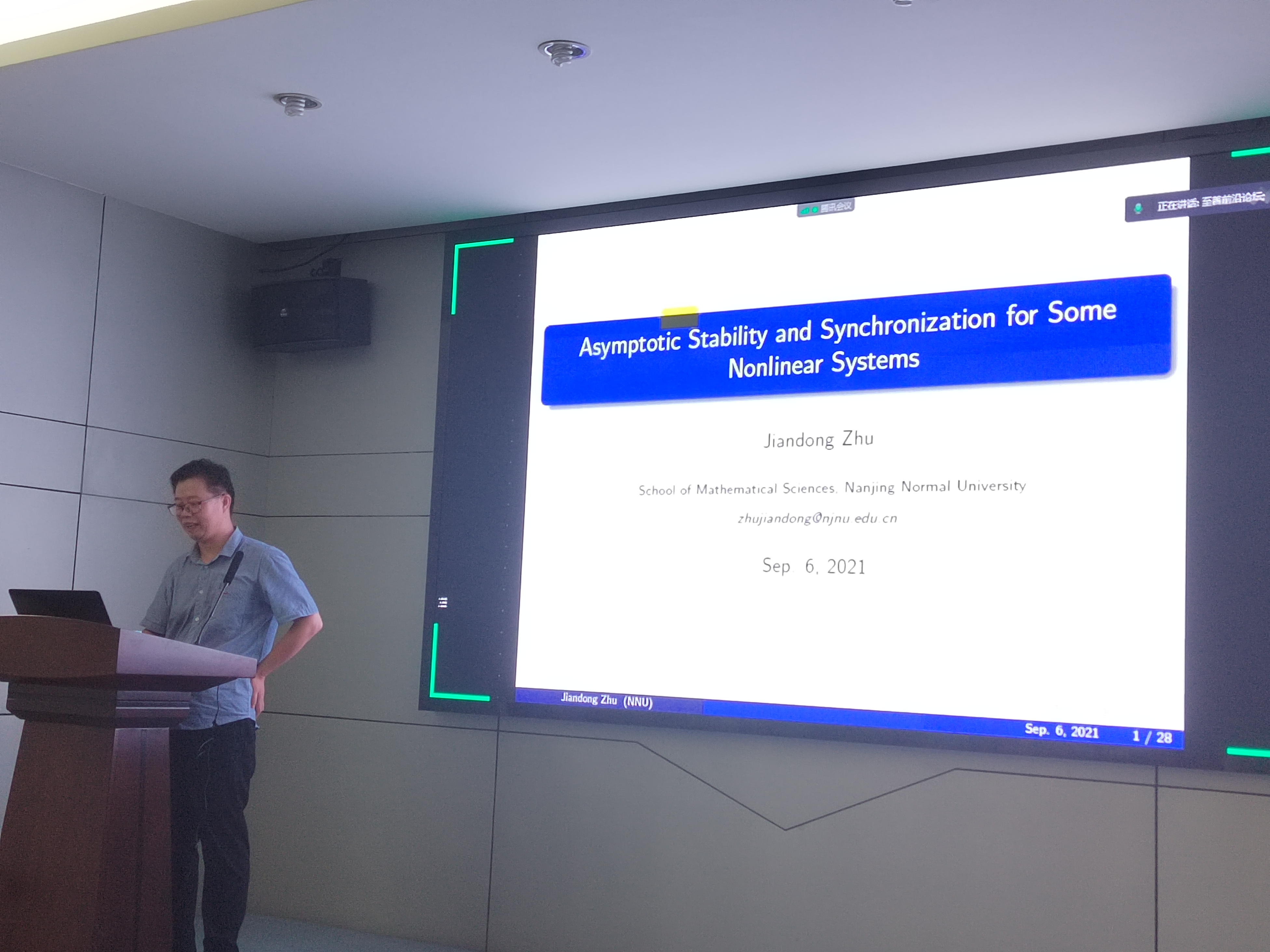 在论坛的第五场报告中,南京师范大学朱建栋教授作了“几类非线性系统的稳定性及一致性分析”的报告,该报告介绍两类非线性系统的稳定性分析方面的新结果,并对进一步的研究给出展望。介绍一类非线性多个体系统高维Kuramoto模型的研究背景、一致性理论分析、近期的研究成果及未来这一方向的研究及应用潜力。