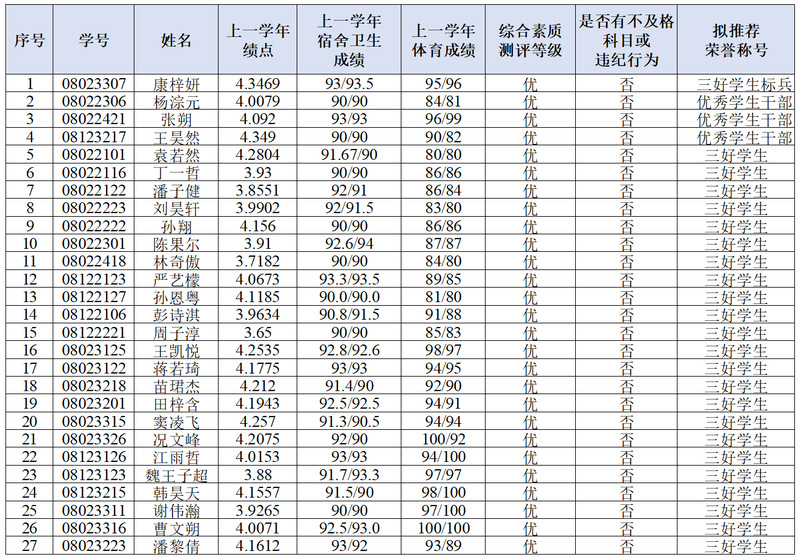 根据学校通知要求和评审工作安排,经学生本人申请、班级民主评议、资格审核、学院评审,拟推荐以下同学申请2024-2025学年365best体育亚洲官网三好学生、三好学生标兵、优秀学生干部荣誉称号。具体名单见下图。