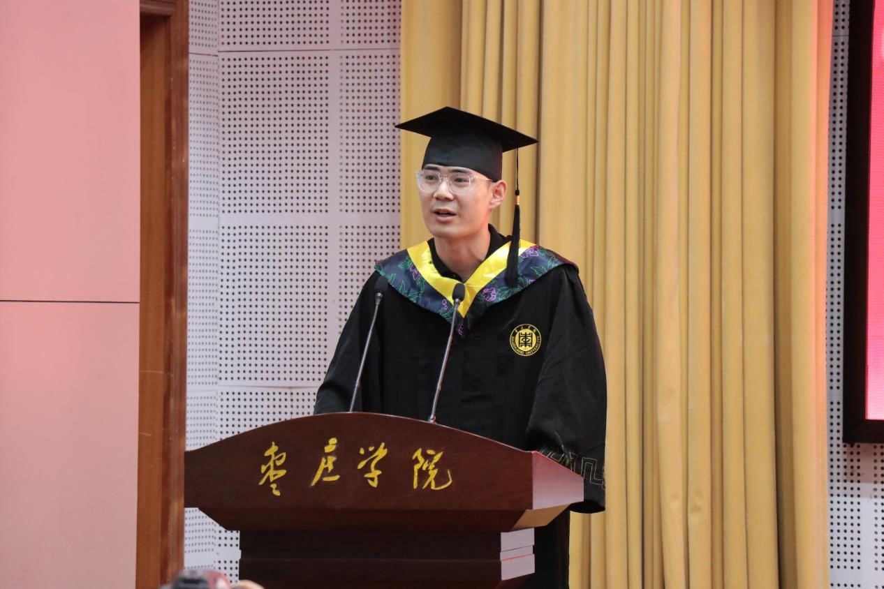 2019级制药工程专业学生徐以临作为毕业生代表发言。他代表2023届毕业生为母校、恩师和师弟师妹送去了诚挚的祝福,表达了深深的感恩之情。他表示,作为青年学生,同学们要坚定不移听党话、跟党走,怀抱梦想又脚踏实地,敢想敢为又善作善成,立志做有理想、敢担当、能吃苦、肯奋斗的新时代好青年,让青春在全面建设社会主义现代化国家的火热实践中绽放绚丽之花。