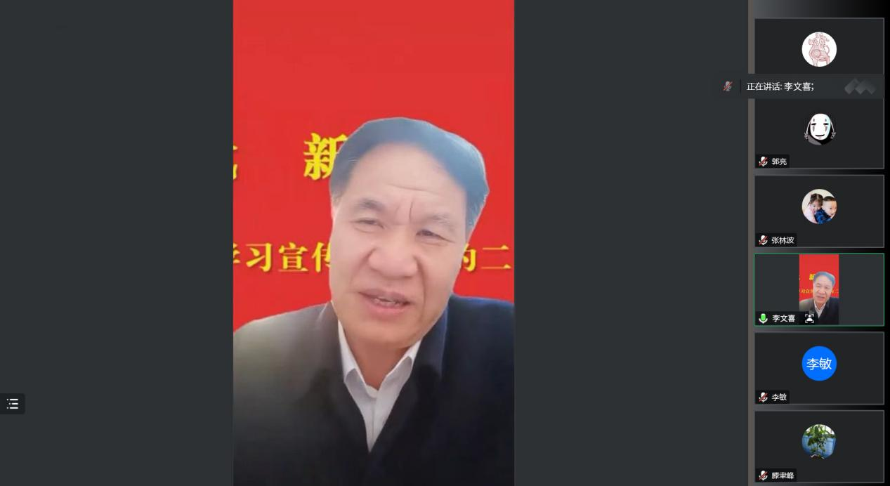 12月28日下午,校党委副书记、校长李文喜为yabo鸭脖官网全体教师党员作党的二十大精神宣讲报告。报告会采取腾讯会议线上方式进行,yabo鸭脖官网党总支书记滕聿峰主持。