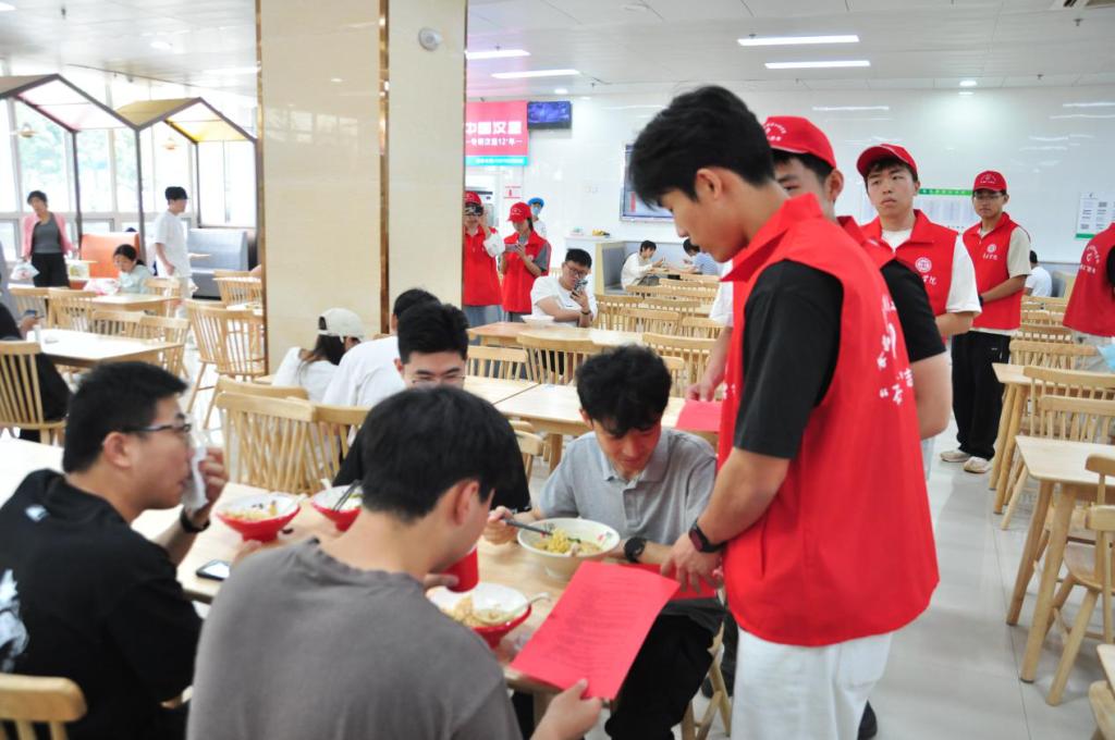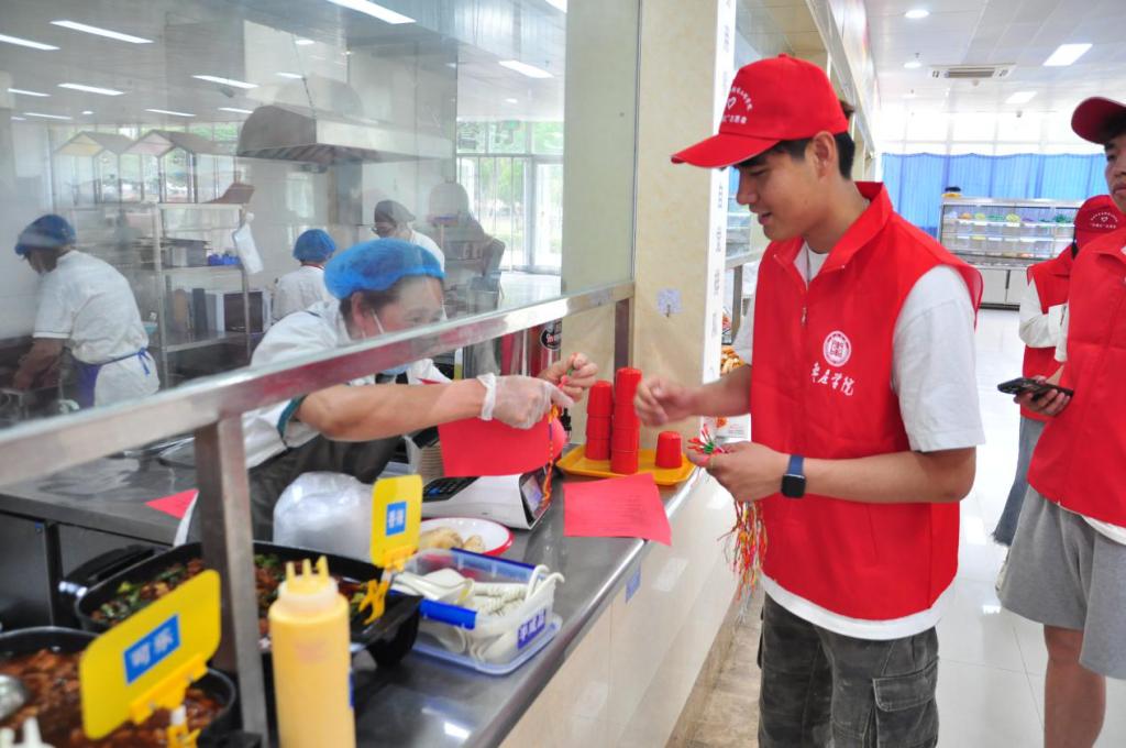 5月23日,学院将活动延伸至教职工餐厅。活动现场,关于食品安全的易拉宝依旧有序摆放,志愿者结合专业知识,对过往教职工及学生讲解食品安全知识,尤其针对夏季食品存放问题做出细致解答。随后,志愿者走进餐厅,为工作人员派发食品安全传单,并送上寓意吉祥的五彩绳,让大家在学习知识的同时,感受到浓浓的端午节日关怀。宣讲临近尾声,志愿者与在场教职工、学生共同喊出“外卖图快捷,健康需警惕”的口号,呼吁大家重视食品安全问题。