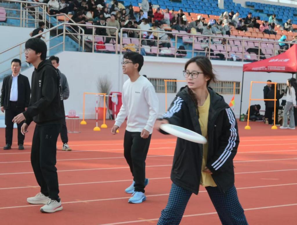 本次运动会精心设计了丰富多样的比赛项目,兼顾团体协作与个人挑战。团体项目中,多人跳绳考验多名队员的同步节奏,绳子翻飞间展现默契共振;拔河比赛则让各班队员紧握长绳、凝心聚力,在呐喊声中上演“力拔山河”的激烈对抗;传盘接力要求选手以飞盘为载体,通过快速传递与奔跑完成冲刺,展现速度与技巧的结合。单人项目过河搭桥则聚焦个人能力,选手需利用三块“木板”交替移动通过“河流”障碍,在平衡与策略中挑战极限。赛场上,选手们或配合默契、或奋勇争先,场外观众的加油声、欢呼声此起彼伏,西田径场成为一片欢乐的海洋。