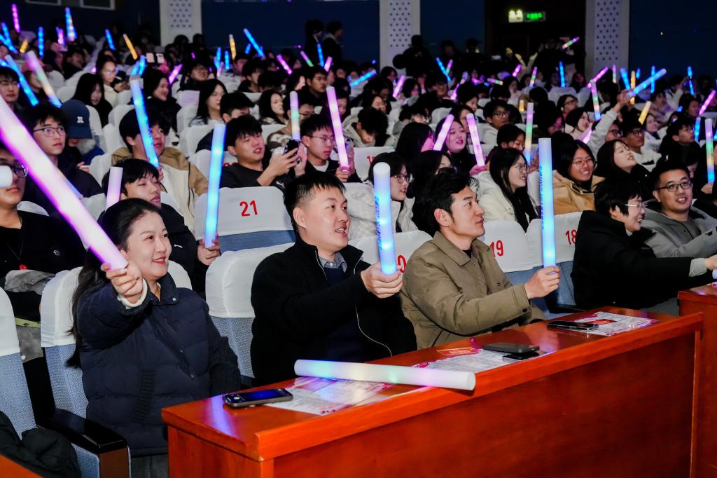 温情与欢乐交织,精彩从未间断。韩国外教老师惊喜登台献唱,醇厚歌声中满是真挚情谊,台下观众纷纷挥手应和,掌声热烈持久,为晚会增添了别样的跨国温情。紧接着,小品《没有学习的人不伤心》爆笑登场,演员们以生动传神的表演、贴近校园生活的剧情,将现场气氛推向欢乐顶峰,台下笑声不断、喝彩连连。节目间隙,抽奖环节与“知校、爱校、荣校”知识竞答轮番上线,现场观众踊跃参与、积极互动,幸运中奖者的欢呼与答题正确率超高的喝彩声交织,让晚会的欢乐氛围持续升温,尽显师生同乐的温馨画面。