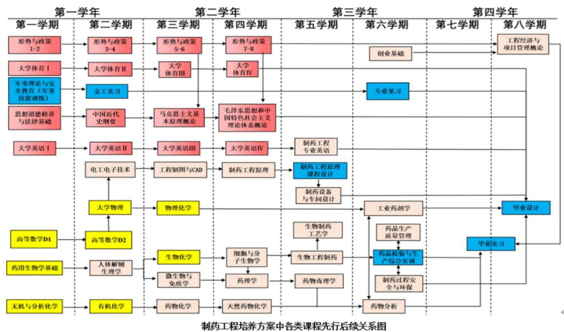 本专业课程体系完善,包括有机化学、物理化学、化工原理、药物化学、工业药剂学、工业药物分析、药品生产质量管理工程、制药设备与车间设计、制药工艺学、制药过程安全与环保等核心课程,以及制药工程基础实验、制药工程专业实验、制药工程课程设计、药品生产综合实训等实践环节,确保学生全面掌握专业知识和技能。