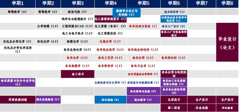 本专业课程体系完善,包括有机化学、无机及分析化学、食品化工原理、食品化学、食品毒理学、食品微生物学、食品营养学、食品工艺学、仪器分析、食品分析、食品卫生学、食品质量安全管理学、食品机械与设备、食品微生物检验、食品添加剂、食品标准与法规、食品工厂设计等核心课程,以及实验、课程设计、创新创业实训、见习实习等实践环节,确保学生全面掌握专业知识和技能,做到毕业就能就业。