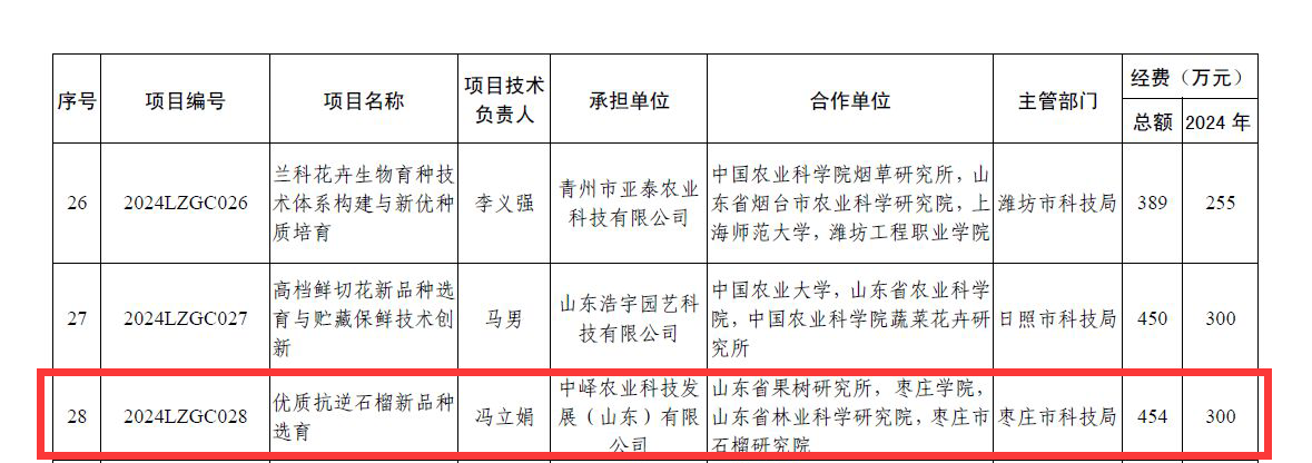 近日,山东省科技厅公布了全省重点研发计划的立项情况,由我校联合申报的农业良种工程项目“优质抗逆石榴新品种选育”(编号:2024LZGC028)成功获批立项,项目总经费为454万元。