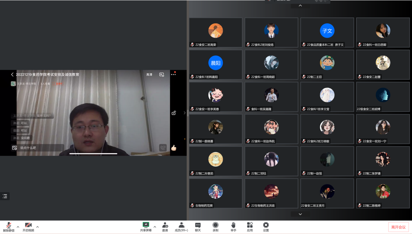 王京龙解读了学院期末线上考试工作方案,对“雨课堂或学习通”+“腾讯会议”双机位考试流程及注意事项进行了详细讲解,并要求每位学生做好应对线上考试的准备,遵守考场考试纪律,确保本学期期末考试能够顺利开展。随后,辅导员、班主任老师对同学们提出几点要求:一是要端正态度,充分诚信应考的重要性,把诚信作为践行诚信价值观的重要方式;二要提高思想警惕,杜绝任何侥幸心理,不给作弊留余地;三要积极备考,专心复习,稳扎稳打,以饱满的精神做好期末考试准备;四是科学应对考试焦虑,合理分配时间,保持平和而积极的心态,充分激发动力、理性化解压力。