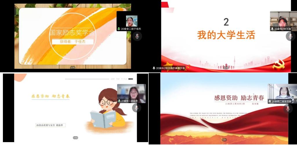 出席发言的优秀学生代表分别是20级食品质量本科2班于佳杰、20级食品科学本科2班沈振、21级食品质量本科2班梁茹萍以及21级制药工程本科2班张亚敏。以上四名同学依次分享了自己的学习经验和在校生活,并结合自己的成长经历表达了受助后的心得感悟,激励同学们要常怀感恩之心,积极进取,把对党和国家的感恩之情转化为努力学习、报效祖国的动力,让青春在不懈奋斗中绽放出绚丽之花。