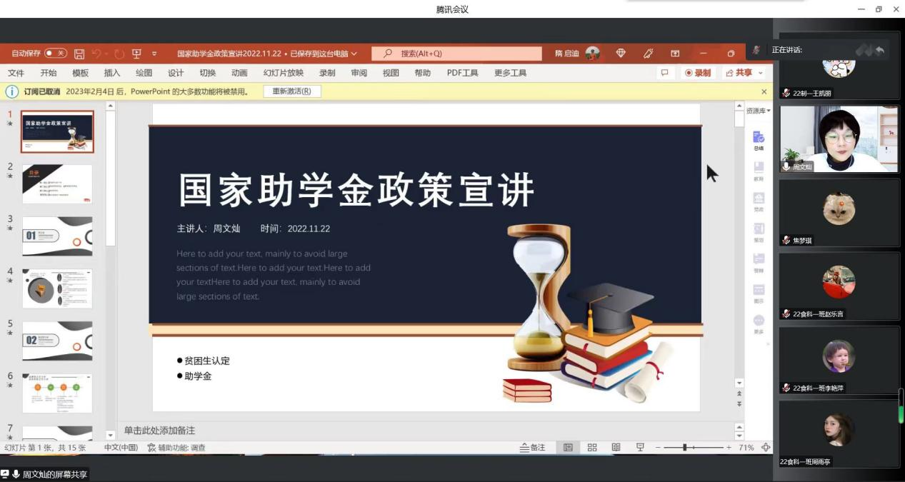 为全面推进资助育人,增强资助政策的宣传力度,增进学生对资助政策的了解和认识,yabo鸭脖官网于11月22日在线上举办国家助学金政策宣讲会。本次会议由学院辅导员周文灿老师担任主讲,2022级全体学生参加。