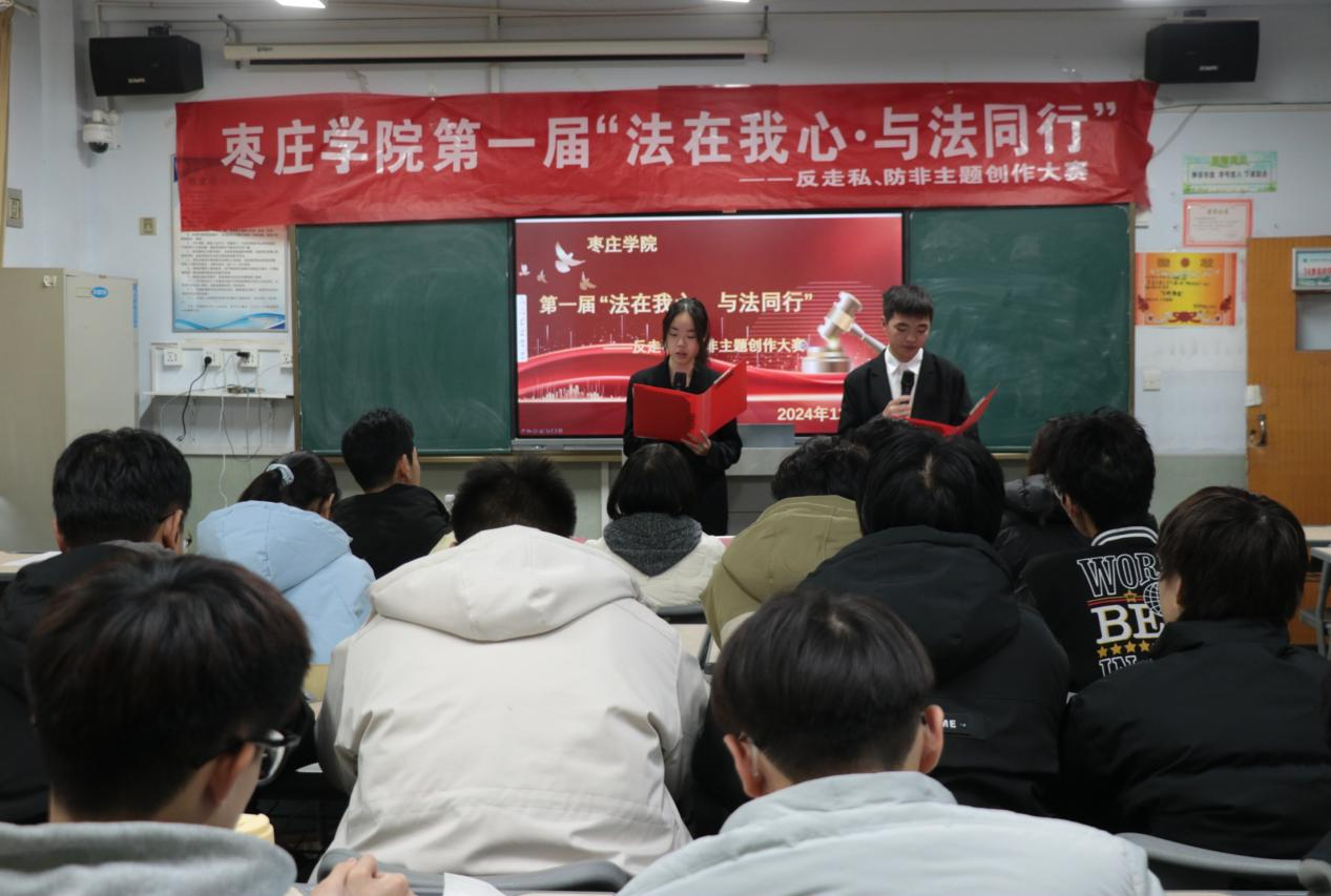 为贯彻落实党的二十届三中全会精神,深入学习习近平法治思想,做好普法宣传工作,12月9日下午,枣庄学院第一届“法在我心·与法同行”——反走私、防非主题创作大赛在文科楼成功举办。本次大赛由共青团枣庄学院委员会主办,yabo鸭脖官网团委承办。