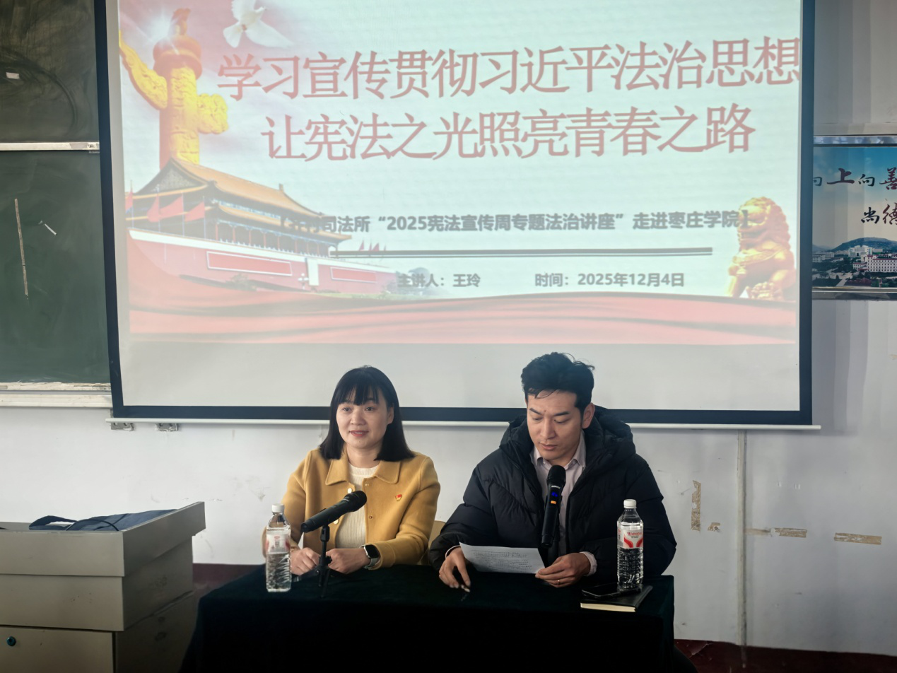12月4日是第十二个“国家宪法日”,又正值第八个“宪法宣传周”。为深入学习宣传宪法、弘扬宪法精神,yabo鸭脖官网团委在文科楼举办 “学习贯彻习近平法治思想,让宪法之光照亮青春之路”主题法治讲座。本次讲座特邀齐村镇司法所王玲所长担任主讲。