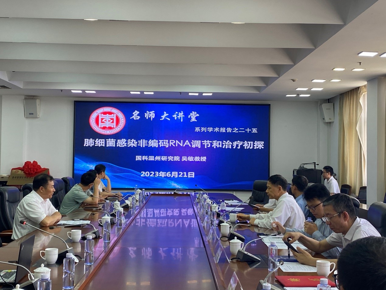 6月21日上午,由yabo鸭脖官网邀请的中国科学院大学温州研究院特聘研究员,“长江学者”吴敏教授在综合楼三楼会议室做客我校“名师大讲堂”,为我校师生作了题为“肺细菌感染非编码RNA调节和治疗初探”的学术报告。yabo鸭脖官网全体专业技术人员及生物制药专业部分学生参加了会议,报告会由yabo鸭脖官网院长张立华主持。