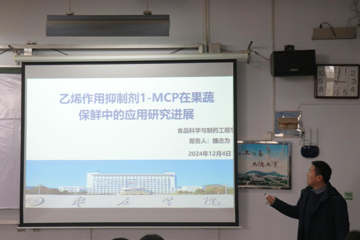 报告会上,魏志为博士做了题为“乙烯作用抑制剂1-MCP在果蔬保鲜中的应用研究进展”的学术报告。魏志为首先介绍了乙烯对园艺作物的采后贮藏及保持商品品质的重要影响,对新型乙烯作用抑制剂1-MCP的性质、作用机制及国内外研究现状进行了总结分析,并提出应用中存在的问题和未来的发展方向。会后,魏志为与师生们进行了深入的交流,并就师生们提出的问题做出了耐心解答。“石榴+植物资源开发”团队教师对此次报告会进行了专题交流研讨。