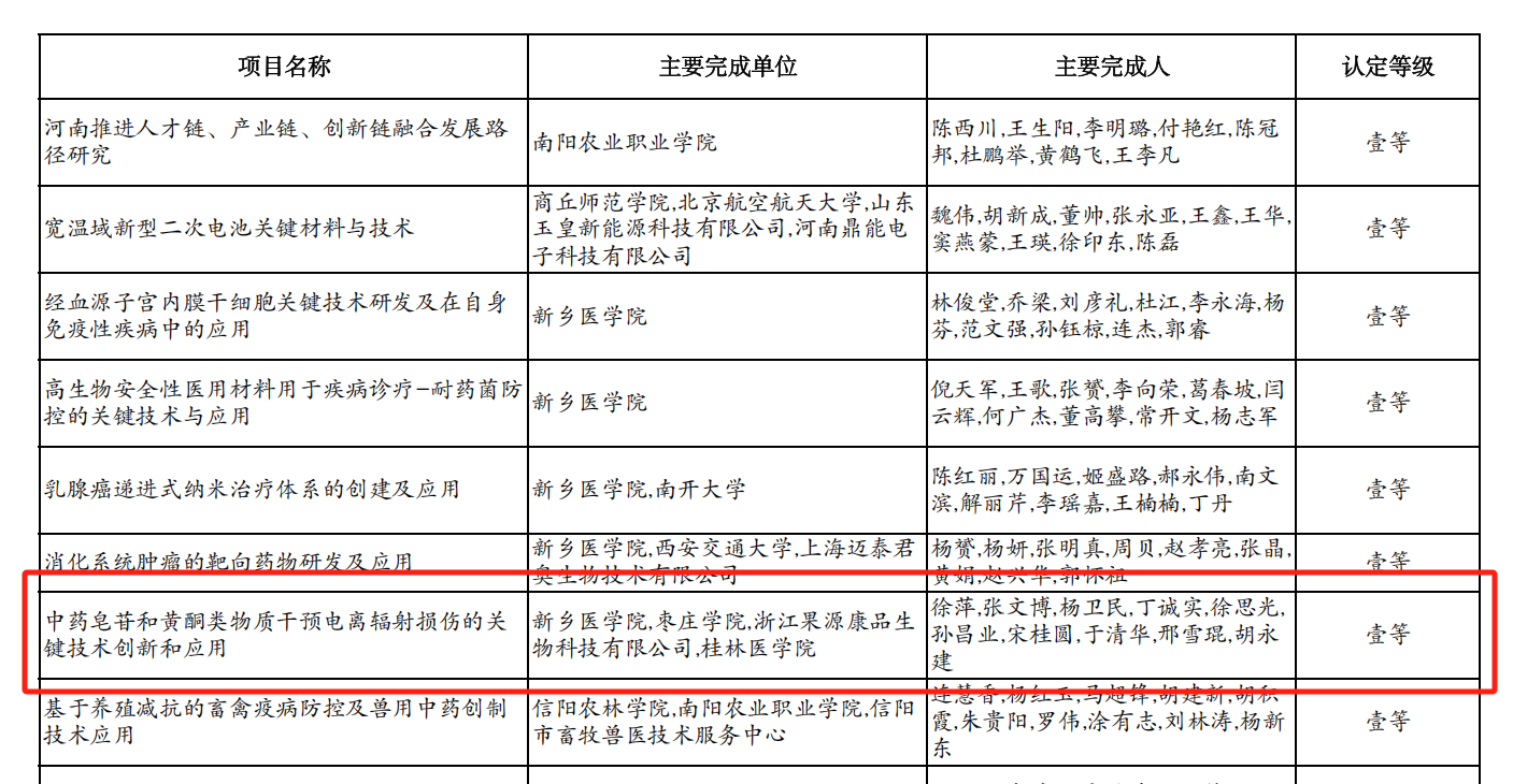 近日,河南省教育厅2025年度科技成果奖评奖揭晓。根据《河南省教育厅办公室关于开展2025年度科技成果评定暨河南省科学技术奖提名工作的通知》有关要求,经申请并组织专家评审,我校yabo鸭脖官网特聘高层次专家人才徐萍教授与新乡医学院联合申报的“中药皂苷和黄酮类物质干预电离辐射损伤的关键技术创新和应用”项目荣获一等奖,徐萍为该项目负责人、第一获奖人。