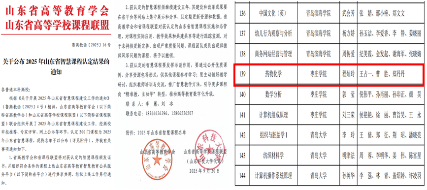 近日,山东省高等教育学会、山东省高等学校课程联盟公布了2025年智慧课程认定结果,yabo鸭脖官网程灿玲老师主讲的《药物化学》课程成功入选。这一成果的取得是食药学院贯彻落实枣庄学院“智能+”赋能教育教学改革“4+2”行动实施方案的具体实践,也标志着食药学院在人工智能赋能教育教学方面取得突破性进展。